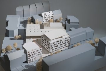 Der Neubaukomplex besteht aus zwei mehrstöckigen Gebäuden an der Straße, einem Supermarkt im Hinterhof sowie einer Tiefgarage darunter mit 200 Plätzen. Die Schule zieht auf den zwei oberen Etagen des größeren Gebäudes ein. Die übrigen Räume werden in erster Linie von Praxen oder Büros genutzt, ins Erdgeschoss zieht eine Apotheke.
