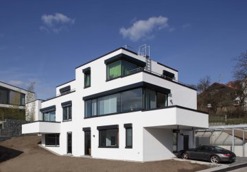 An solch einem Hang, auf einem ehemaligen Weinberg in Zwingenberg, hat das Darmstädter Büro ruby³ architekten vier Doppelhäuser geplant und gebaut. Massiv und strahlend weiß mit betont schwarzen Fensterrahmen bilden sie ein Ensemble, das sich von der heterogenen umgebenden Bebauung stark abgrenzt. Zwischen stattlichen Villen aus dem beginnenden vorigen Jahrhundert, öden Einfamilienhäusern der 70er und 80er Jahre und vereinzelter neuer Architektur betuchter Unternehmerfamilien stehen die in klarer, schnörkelloser Ästhetik errichteten Gebäude. Sie wirken fast wie Außenseiter, ein bisschen unpassend in diesem Wohngebiet. Aber kann man überhaupt in dieses Baustilgemisch moderne Architektur integrieren, ohne dass sie wie ein Fremdkörper wirkt?